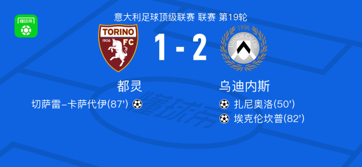 扫描下载懂球帝首页>动态> 乌迪内斯2-1都灵,埃克伦坎普建功,扎尼奥洛破门