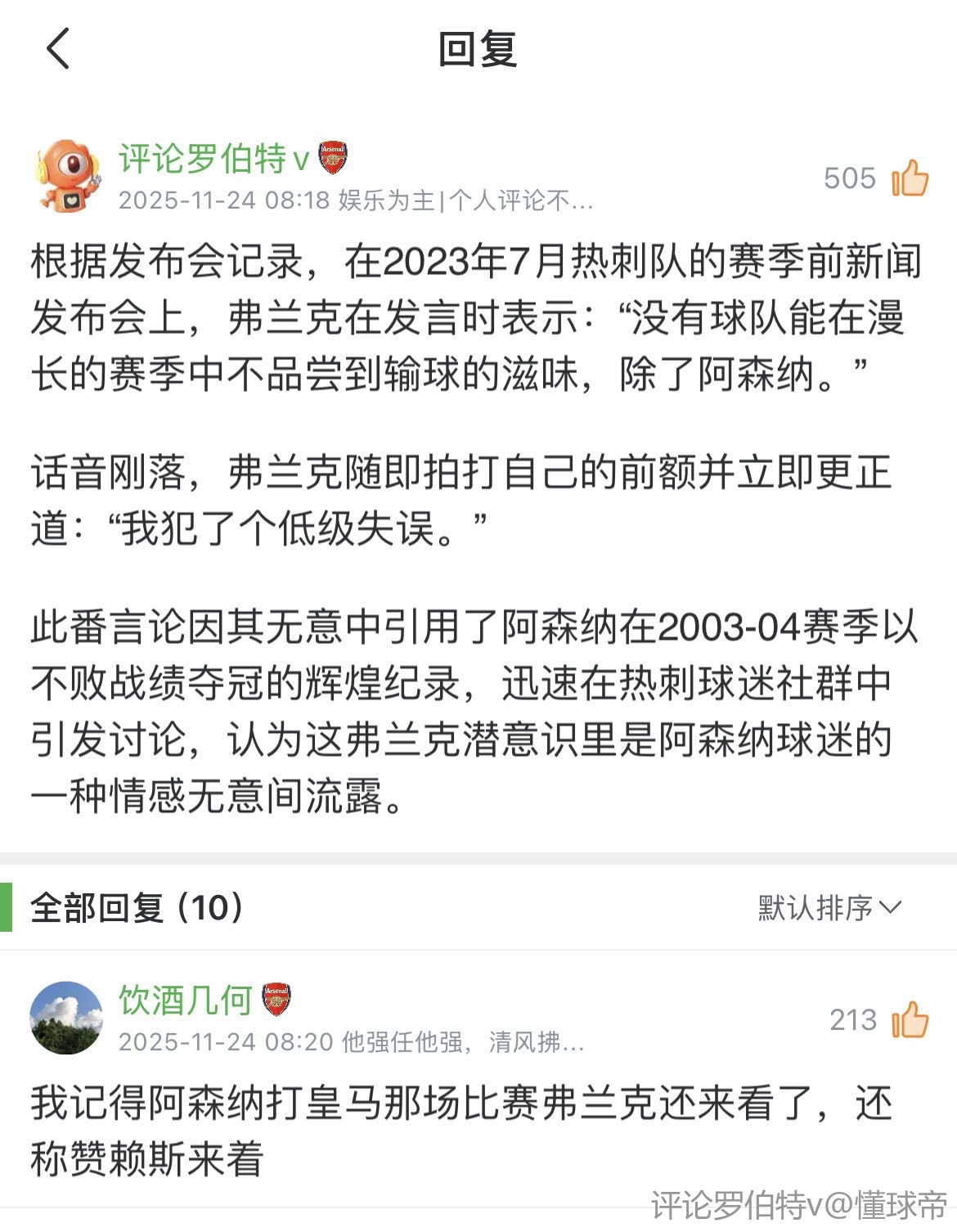 这赛季弗兰克带热刺夺欧冠,他穿阿森纳队服在场边指挥我都支持他