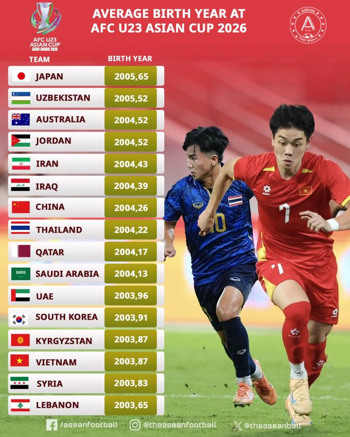 平均年龄都在23岁以下 说明亚洲足球整体水平偏年轻化