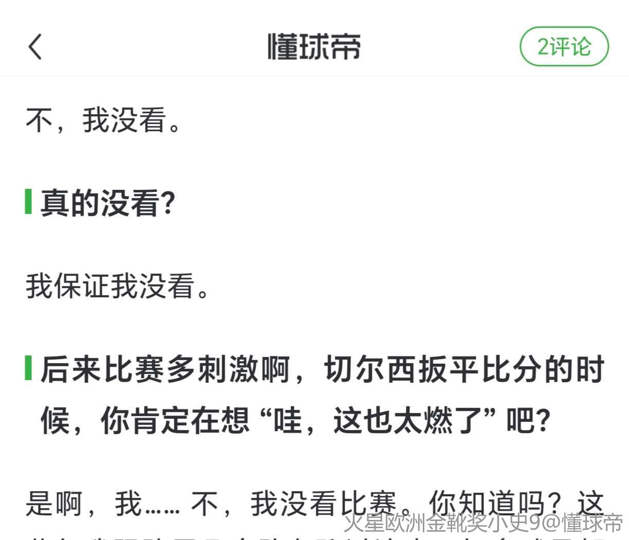 是啊。不过那之后——我感觉我们队就没再获得过那么好的任意球机会了。不过兄弟,我也说不清,每次回看那场比赛的录像,我都……