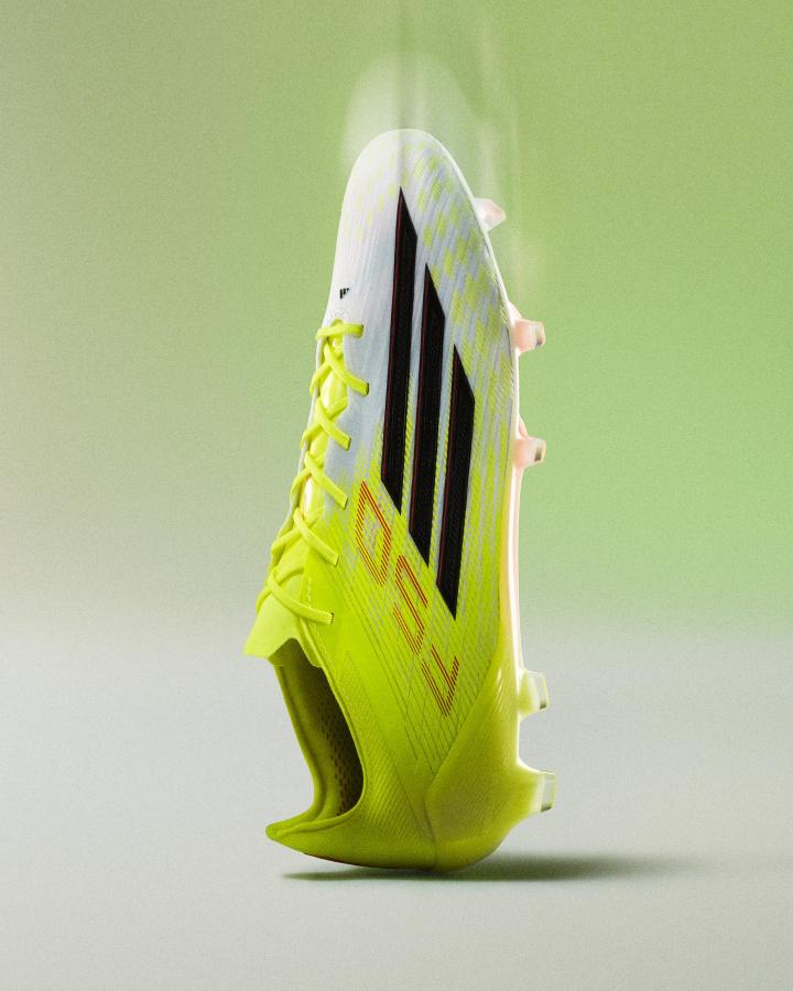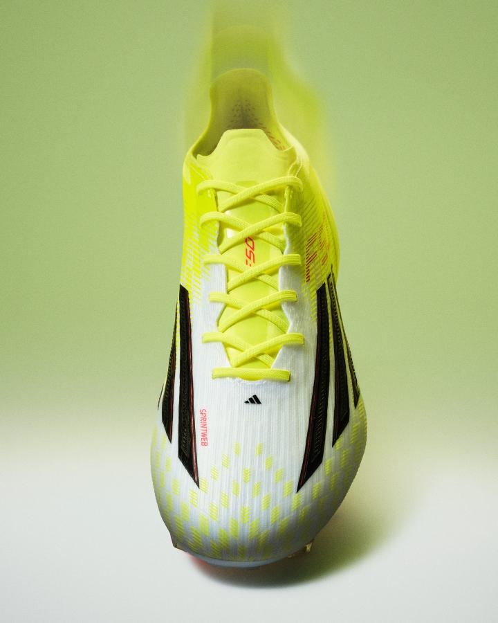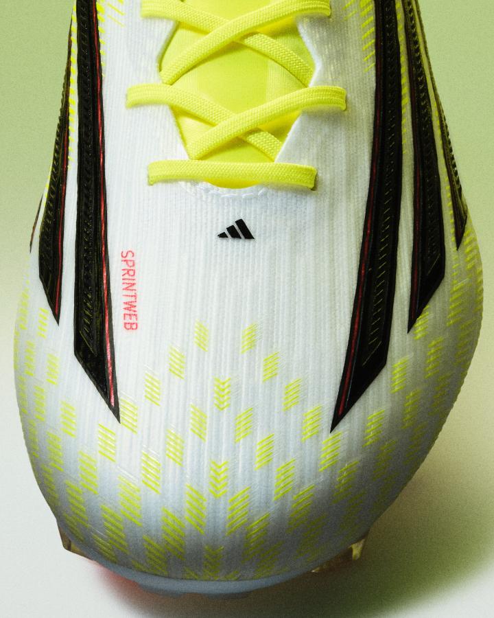 新一代F50则以充满活力的配色焕新登场,从后跟亮眼的柠檬色,顺滑渐变至中足与前掌的纯白色,如同高速运动中留下的光影轨迹,尽显战靴灵动气质。球鞋搭载FIBERTOUCH轻羽系统,在关键部位提供轻量支撑与缓震防护,兼顾性能与舒适体验;SPRINTWEB蝉翼鞋面则以高精度3D纹理设计,适配灵活盘带需求。 TUNNEL TONGUE管道式鞋舌提供多方向高速运动所需的锁定感,搭配SPRINTFRAME 360+大底,助力球员稳控步伐,化身绿茵场上的闪电。
