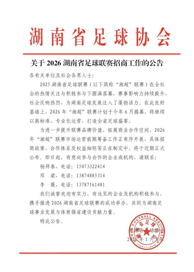 我们诚挚欢迎有实力、有远见的企业及机构积极参与,携手推进2026湖南省足球联赛的成功举办,共同为湖南足球事业发展与体育强省建设贡献力量。