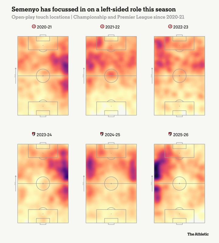 从他的触球位置热图(下图)可以看出,直到2023年1月转会英超后,塞门约才被主要安排到边路。最初他在伯恩茅斯主要在右路崭露头角,随后几个赛季逐渐转移到另一侧。