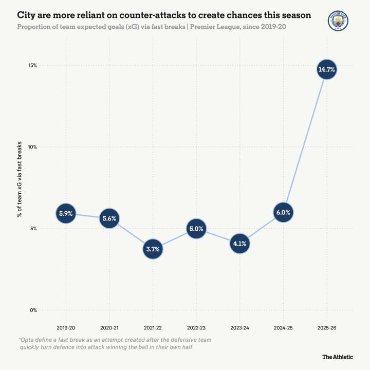 从下方的可视化图表中我们可以看到,这支曼城并不畏惧快速进攻,他们通过Opta定义的“快速反击”创造了接近15%的预期进球(xG)——与过往几年的数据相比有显著增长。在2025-26赛季刚过半程之时,他们通过此类反击攻入的进球数,已经超过了此前两个完整赛季的总和。
