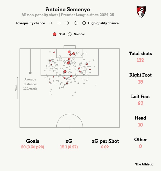 从他的射门位置图(下图)可以看出,这意味着对塞门约而言,禁区内外任何角度和距离都在其射程之内。相对于其预期进球数据,他实际进球数的健康溢出表现,也支撑了他起脚射门的自信。