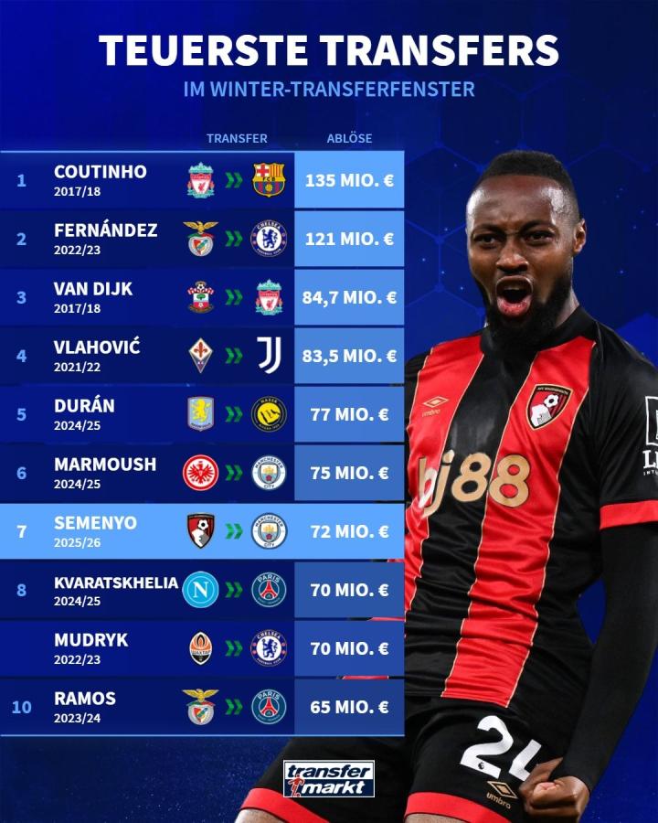 扫描下载懂球帝首页>动态> 德转列冬窗历史最贵交易榜:库鸟居首,塞门约7200万欧第七