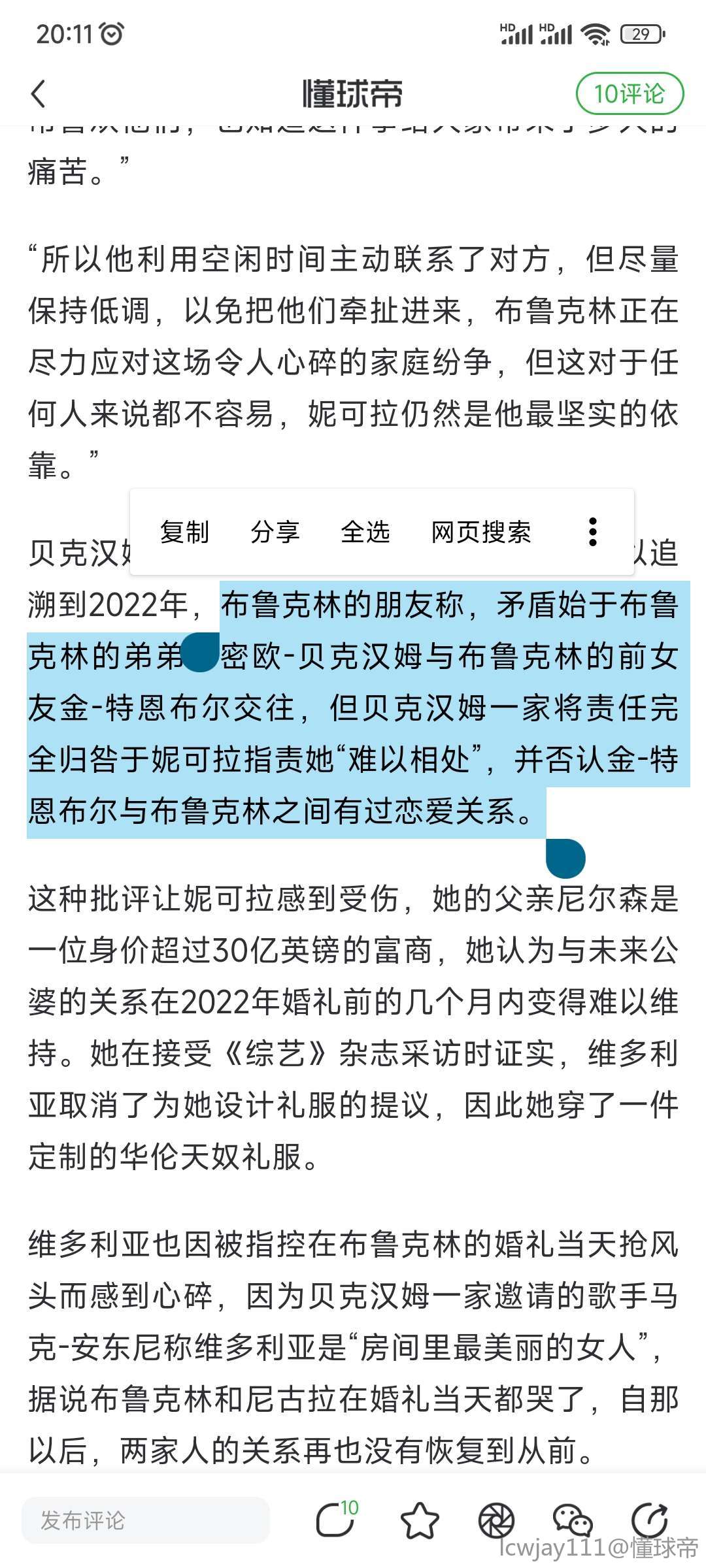 据报道,在维多利亚点赞了布鲁克林-贝克汉姆分享的一段烤鸡视频后,布鲁克林便将父母屏蔽,原因是他们违反了法律协议,随后他致信父母,表示他们只能通过律师联系。贝克汉姆夫妇20岁的小儿子克鲁兹发帖说:“他们(我的父母)醒来发现自己被拉黑了……我也是。”