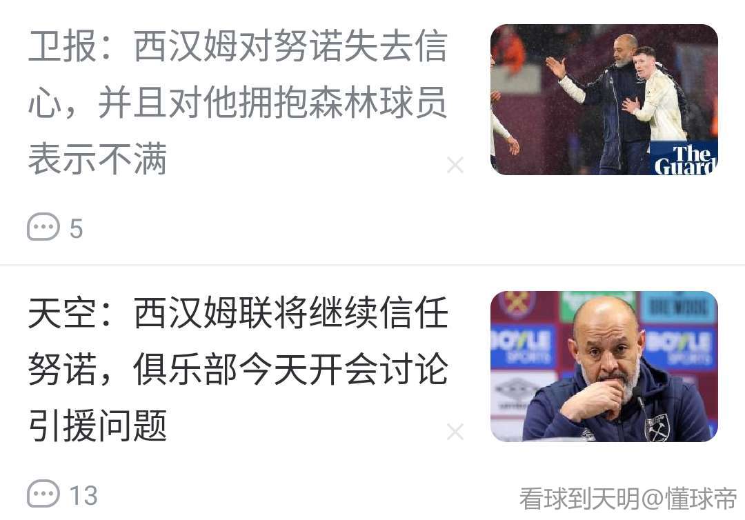 扫描下载懂球帝首页>动态> 卫报:西汉姆对努诺失去信心,并且对他拥抱森林球员表示不满