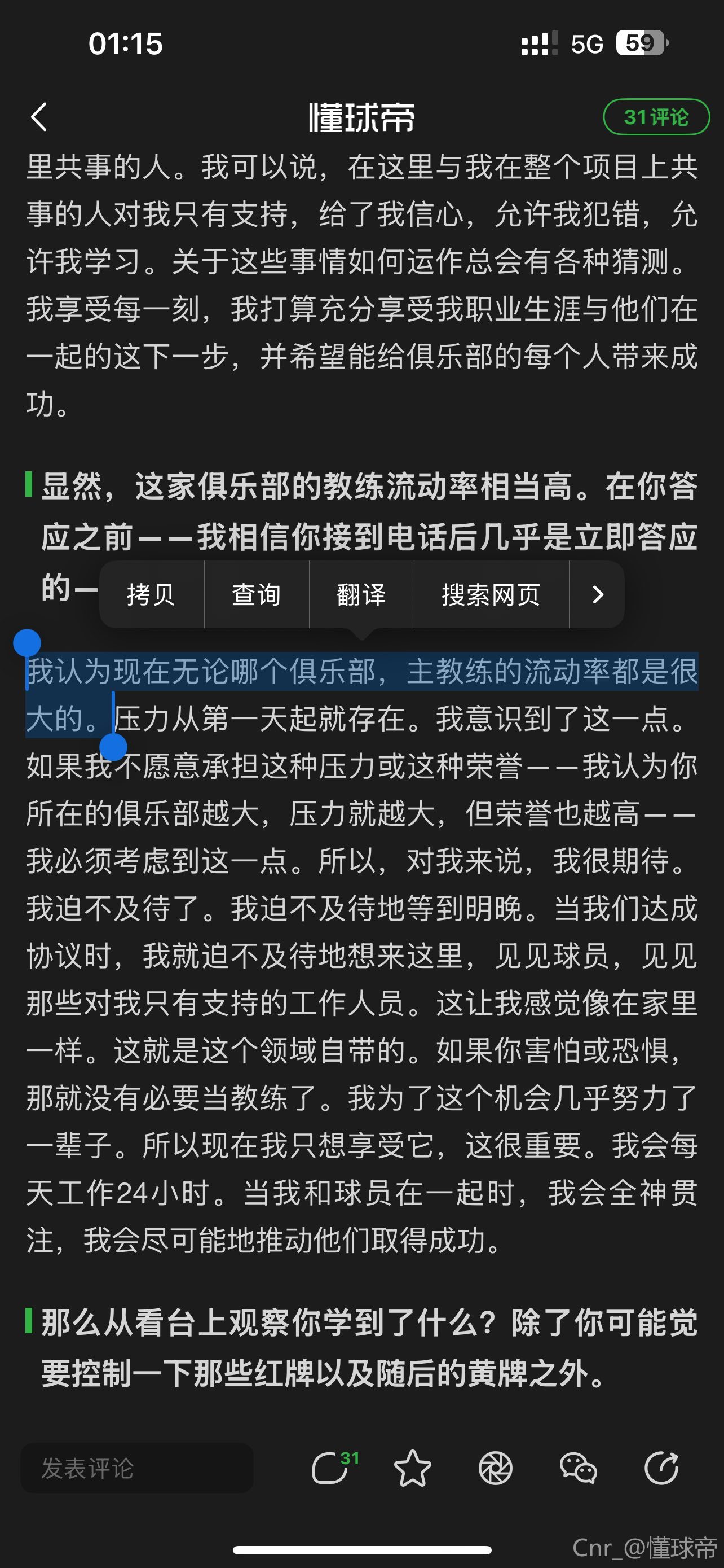 我认为现在无论哪个俱乐部,主教练的流动率都是很大的。压力从第一天起就存在。我意识到了这一点。如果我不愿意承担这种压力或这种荣誉——我认为你所在的俱乐部越大,压力就越大,但荣誉也越高——我必须考虑到这一点。所以,对我来说,我很期待。我迫不及待了。我迫不及待地等到明晚。当我们达成协议时,我就迫不及待地想来这里,见见球员,见见那些对我只有支持的工作人员。这让我感觉像在家里一样。这就是这个领域自带的。如果你害怕或恐惧,那就没有必要当教练了。我为了这个机会几乎努力了一辈子。所以现在我只想享受它,这很重要。我会每天工作24小时。当我和球员在一起时,我会全神贯注,我会尽可能地推动他们取得成功。
