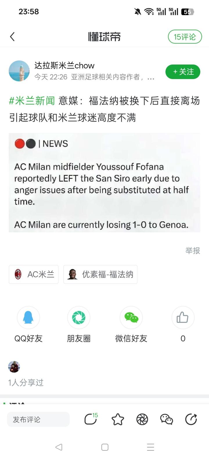 米兰官号第一时间发了莱奥进球后跑去拥抱福法纳,什么时候直接离场了?