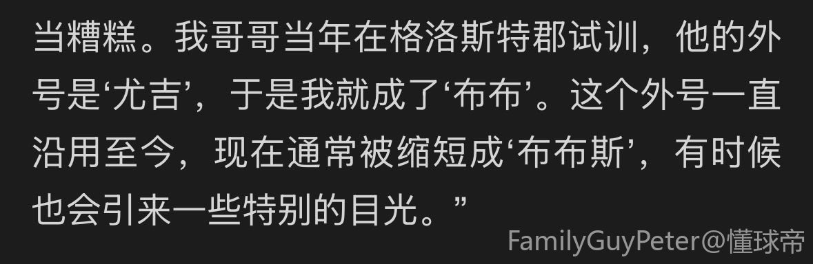 相比儿子在足球场上的崛起,马克坦言自己并不是一名合格的足球运动员。“我在学校时踢过一点,体能还可以,没球时还凑合,但一拿球就相当糟糕。我哥哥当年在格洛斯特郡试训,他的外号是‘尤吉’,于是我就成了‘布布’。这个外号一直沿用至今,现在通常被缩短成‘布布斯’,有时候也会引来一些特别的目光。”