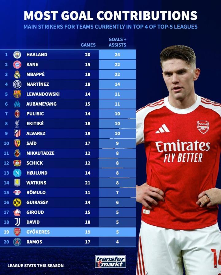 扫描下载懂球帝首页>动态> 五大联赛前四球队前锋参与进球榜:哈兰德第1,哲凯倒数第2