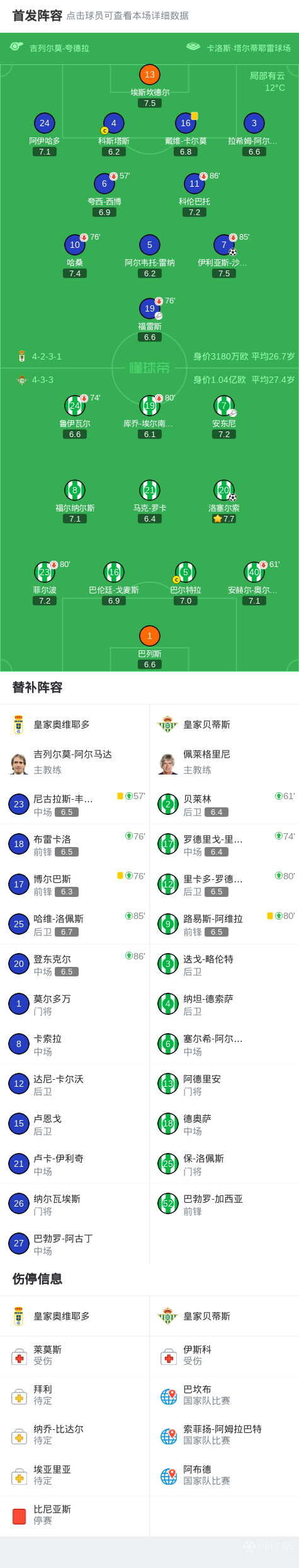 北京时间1月10日西班牙足球甲级联赛 联赛 第19轮,皇家奥维耶多主场对阵皇家贝蒂斯。下半场沙伊拉禁区外贴地斩,之后安东尼传中,洛塞尔索头球破门。最终比分皇家奥维耶多1-1皇家贝蒂斯。