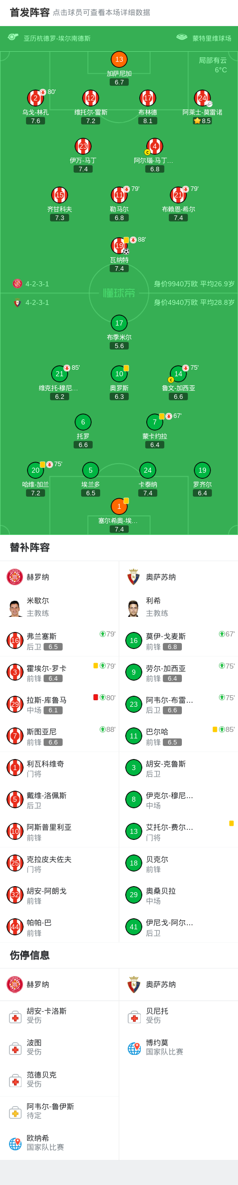 赫罗纳vs奥萨苏纳:勒马尔、布林德首发,布季米尔、哈维-加兰出战
