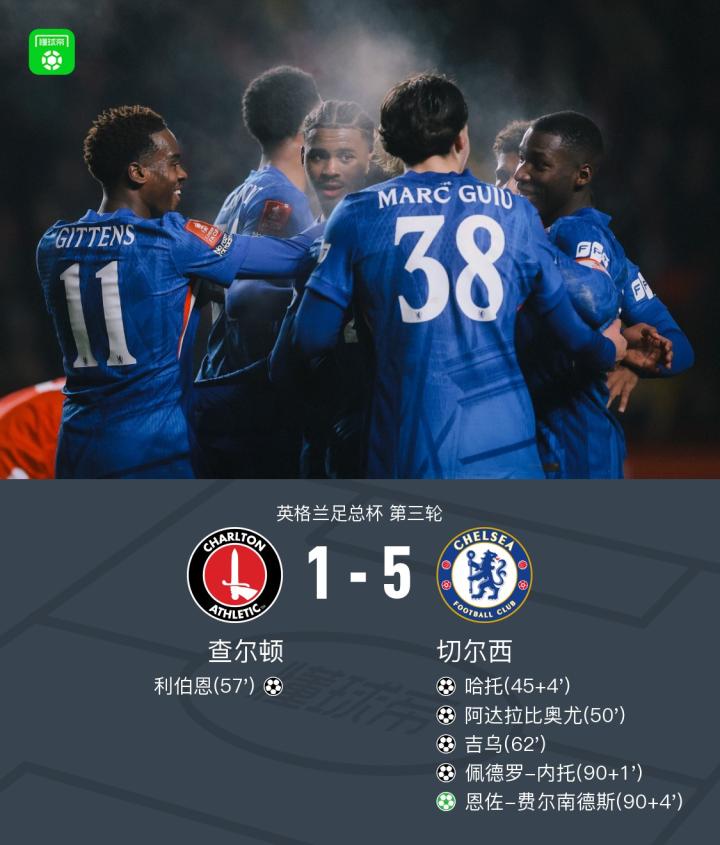 扫描下载懂球帝首页>动态> 切尔西5-1查尔顿,吉乌建功,哈托、阿达拉比奥尤破门