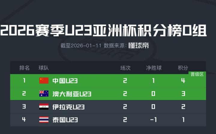 扫描下载懂球帝首页>动态> 中国U23积4分名列小组头名,澳洲第二伊拉克第三泰国垫底
