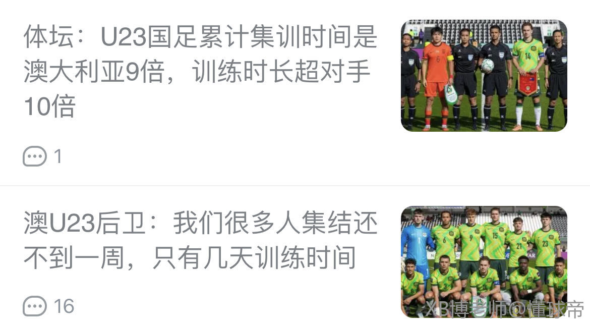 但中国队情况完全不同。安东尼奥带队从预赛出线后,中国U23先后在去年10月、11月国际比赛日组织两期集训,期间不仅与泰国队热身,还参加了熊猫杯赛。而从12月7日在肇庆集结开始,中国U23也在潜力开启备战。实际上在对阵澳大利亚之前,中国队的累计集训时间已有54天,是澳大利亚队备战期的9倍。而恰恰在热身赛方面(包括小组赛第一轮),中国队的场次相比澳大利亚,也是9比1!至于训练时长,澳大利亚队只有5堂课,中国队自去年10月到现在,预估是在60次左右,超过对手十倍。