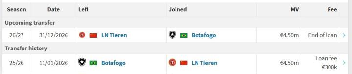 据德转信息显示,热菲尼奥从博塔弗戈租借辽宁铁人的租借费为30万欧元(约合人民币244万元)。