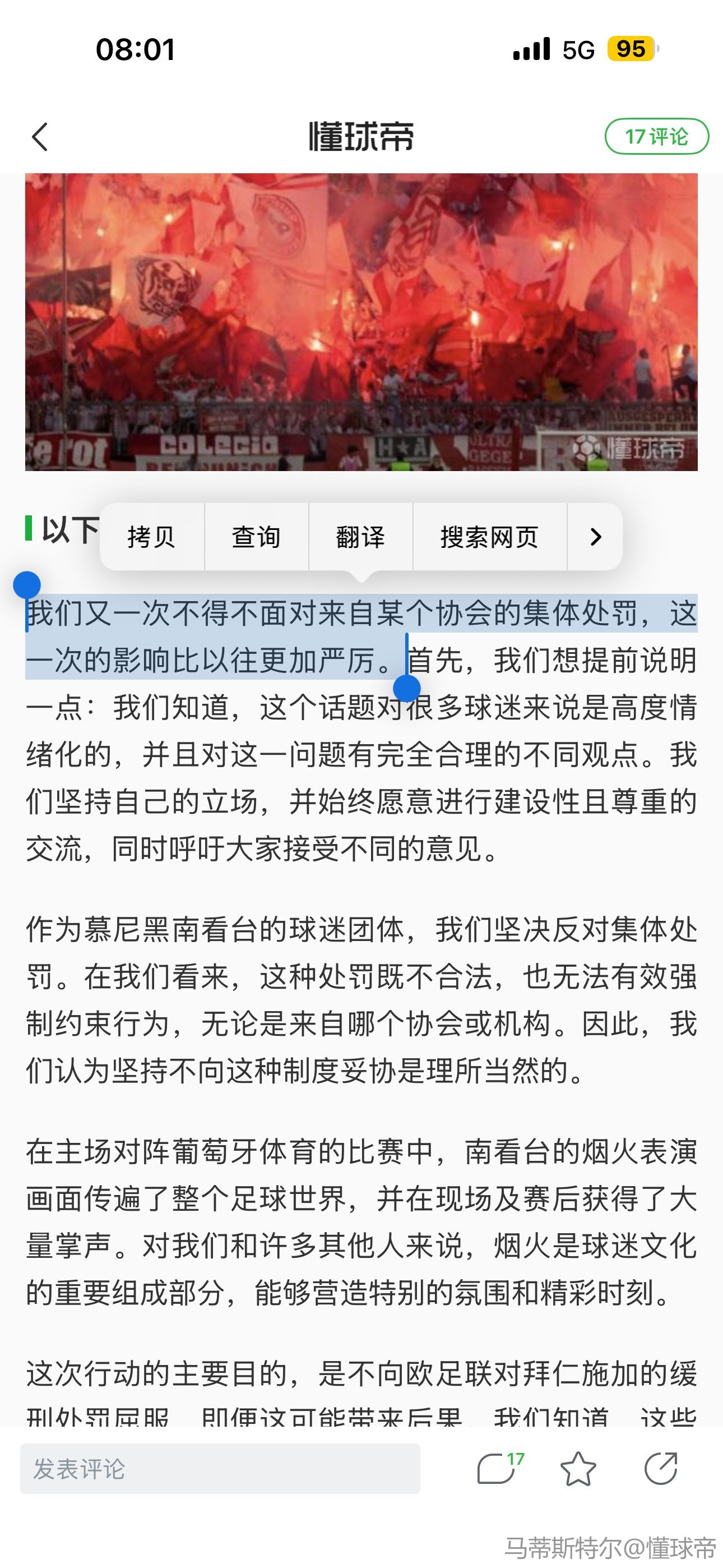 我们希望德国的俱乐部官员能够支持充满活力的球迷文化,并反对集体惩罚,即便我们知道我们的行动会给你们带来许多麻烦。你们在那里有发声渠道,而我们没有。
