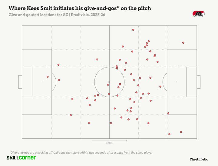 这种摆脱险境并快速出球的能力帮助阿尔克马尔迅速通过球场三区推进。但斯密特并不满足于仅仅发起进攻。他通常会继续跑动,寻求在最后阶段再次出现。下图展示了他的“传跑配合”——这说明了他在禁区边缘接应回传的渴望。