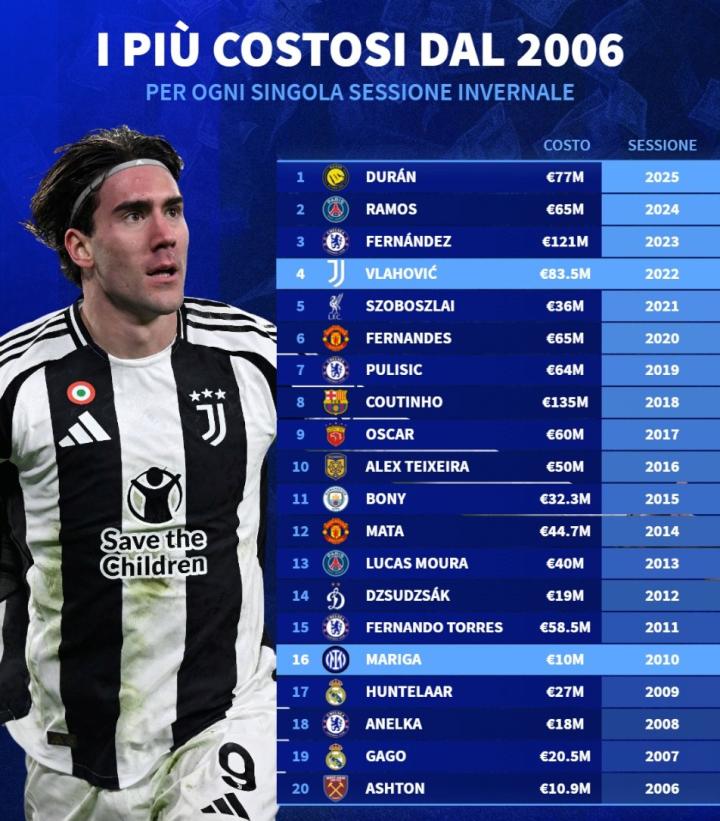 扫描下载懂球帝首页>动态> 德转列06年至25年全球冬窗标王:库鸟1.35亿第1,中超两度上榜