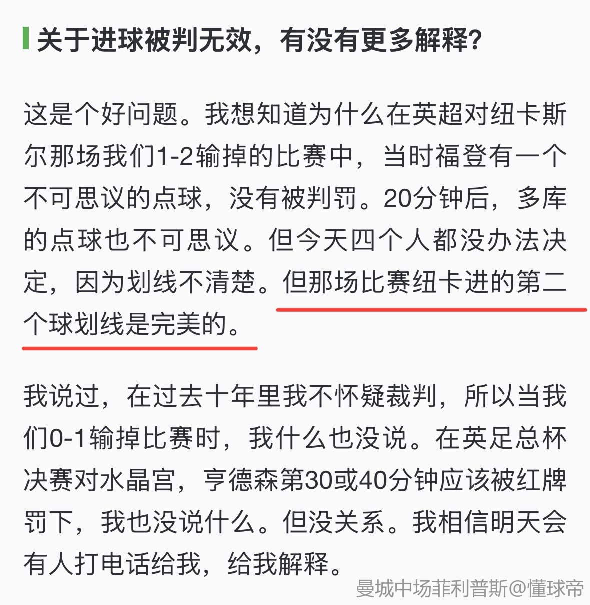 这是个好问题。我想知道为什么在英超对纽卡斯尔那场我们1-2输掉的比赛中,当时福登有一个不可思议的点球,没有被判罚。20分钟后,多库的点球也不可思议。但今天四个人都没办法决定,因为划线不清楚。但那场比赛纽卡进的第二个球划线是完美的。
