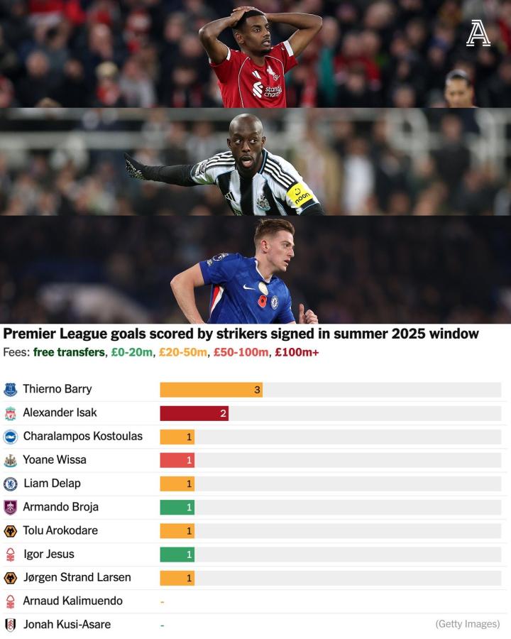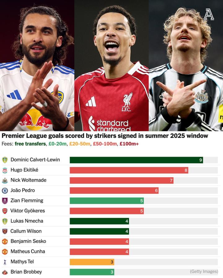 英超去年夏窗转会中锋联赛进球数:勒温居首,埃基蒂克第二