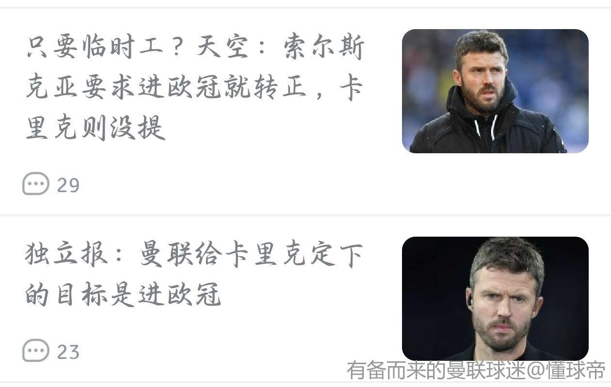 扫描下载懂球帝首页>动态> 只要临时工?天空:索尔斯克亚要求进欧冠就转正,卡里克则没提