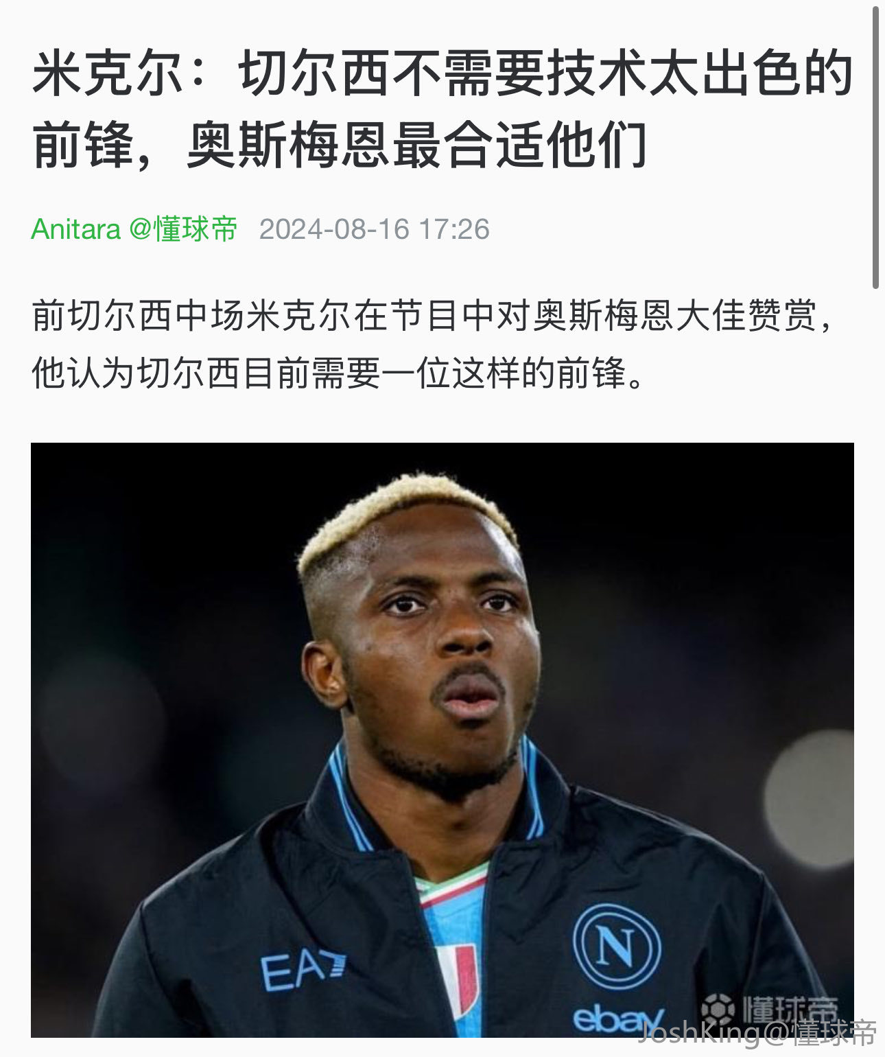 扫描下载懂球帝首页>动态> 米克尔呼吁切尔西签下奥斯梅恩:你需要有经验的前锋