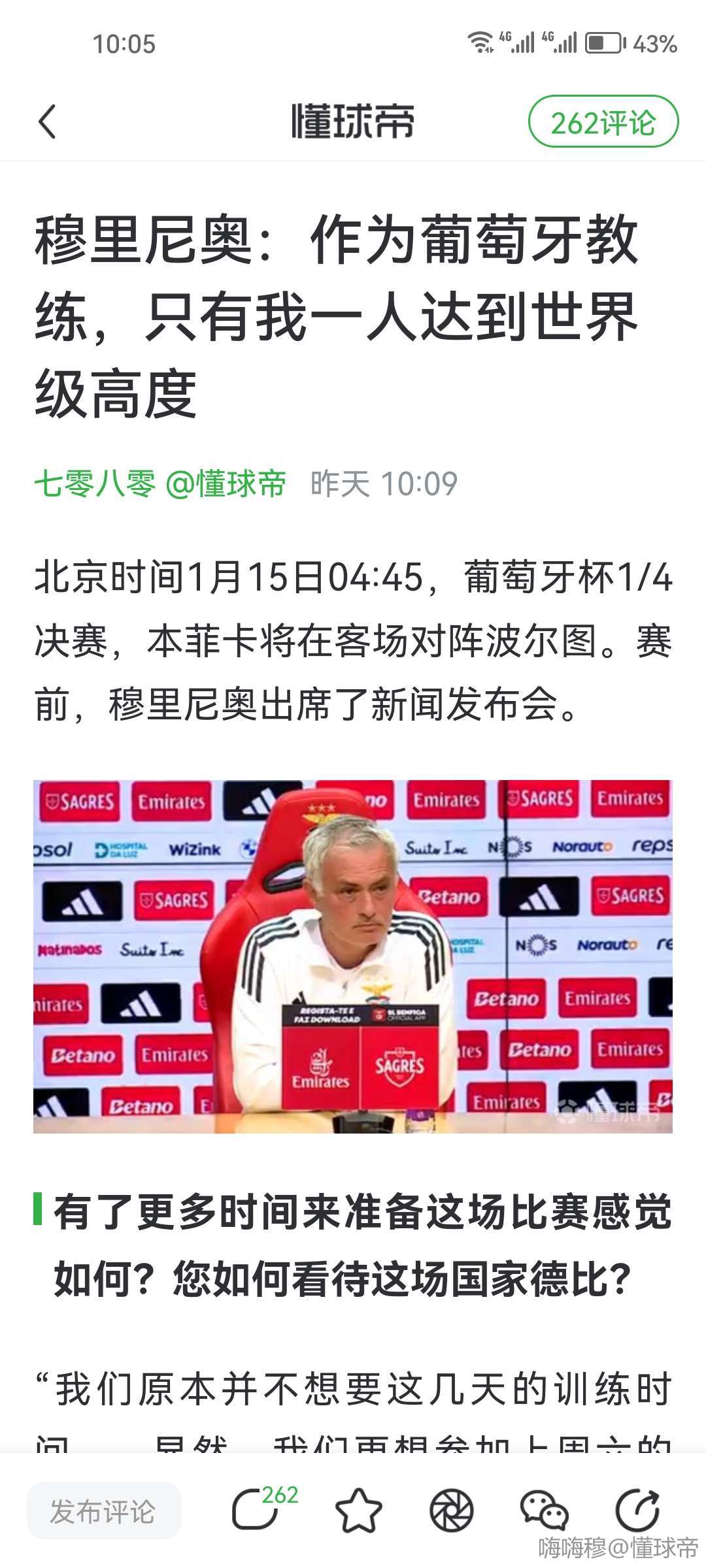 01-15 06:48穆里尼奥:作为葡萄牙教练,只有我一人达到世界级高度