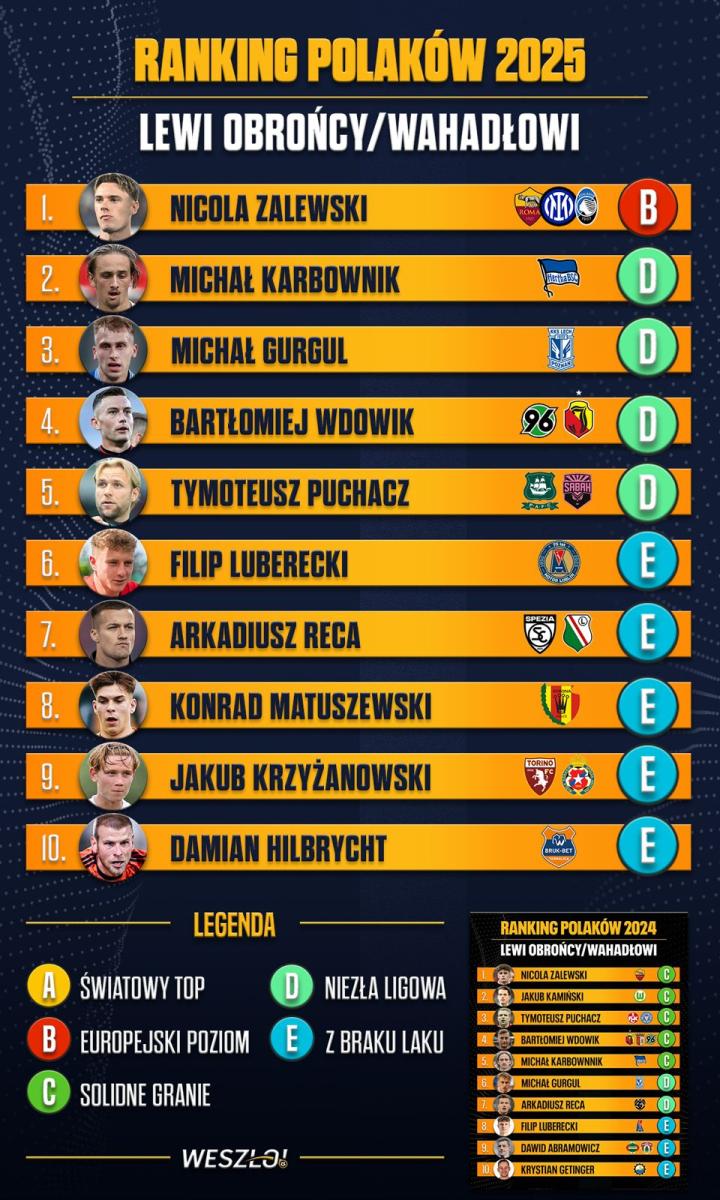 波兰媒体Weszło发布了2025年的波兰球员年终排名,第四份榜单对所有波兰左后卫和左边翼卫进行了点评。扎莱夫斯基连续三年领跑,卡尔博夫尼克、古尔古尔分列二三名。