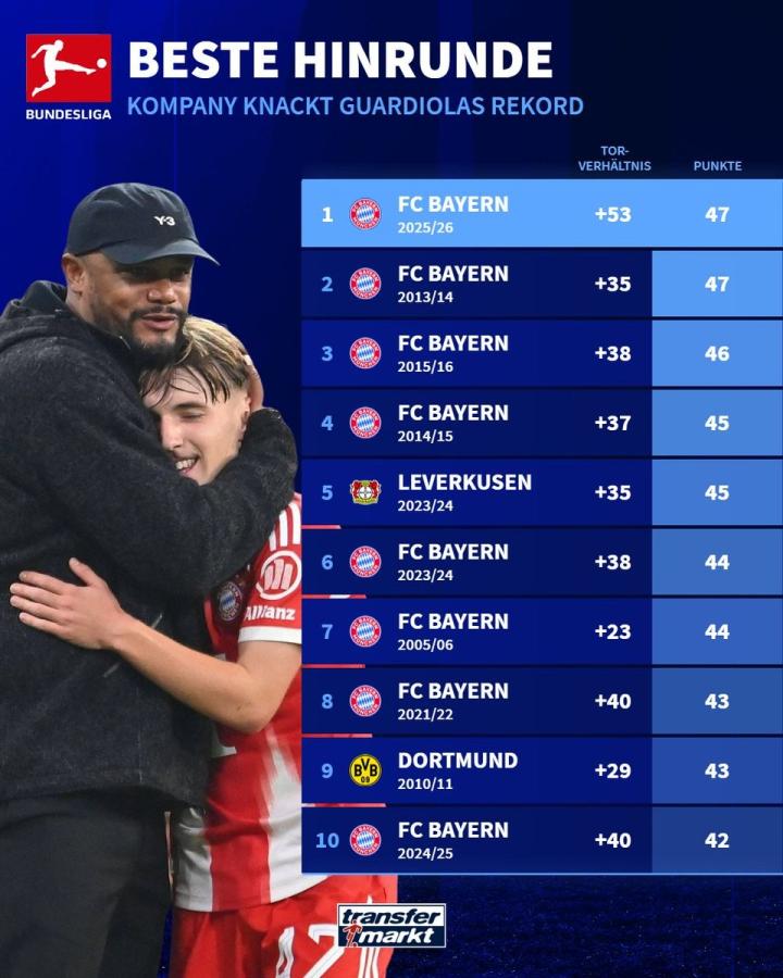 47分且净胜球+53,拜仁创德甲历史上半程最佳战绩