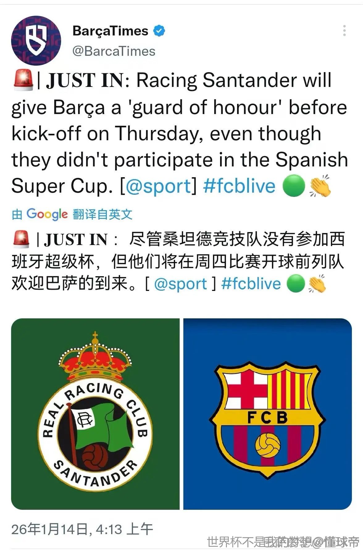 01-16 10:07巴萨社媒发桑坦德列队视频:超级杯冠军的荣誉卫队,谢谢!