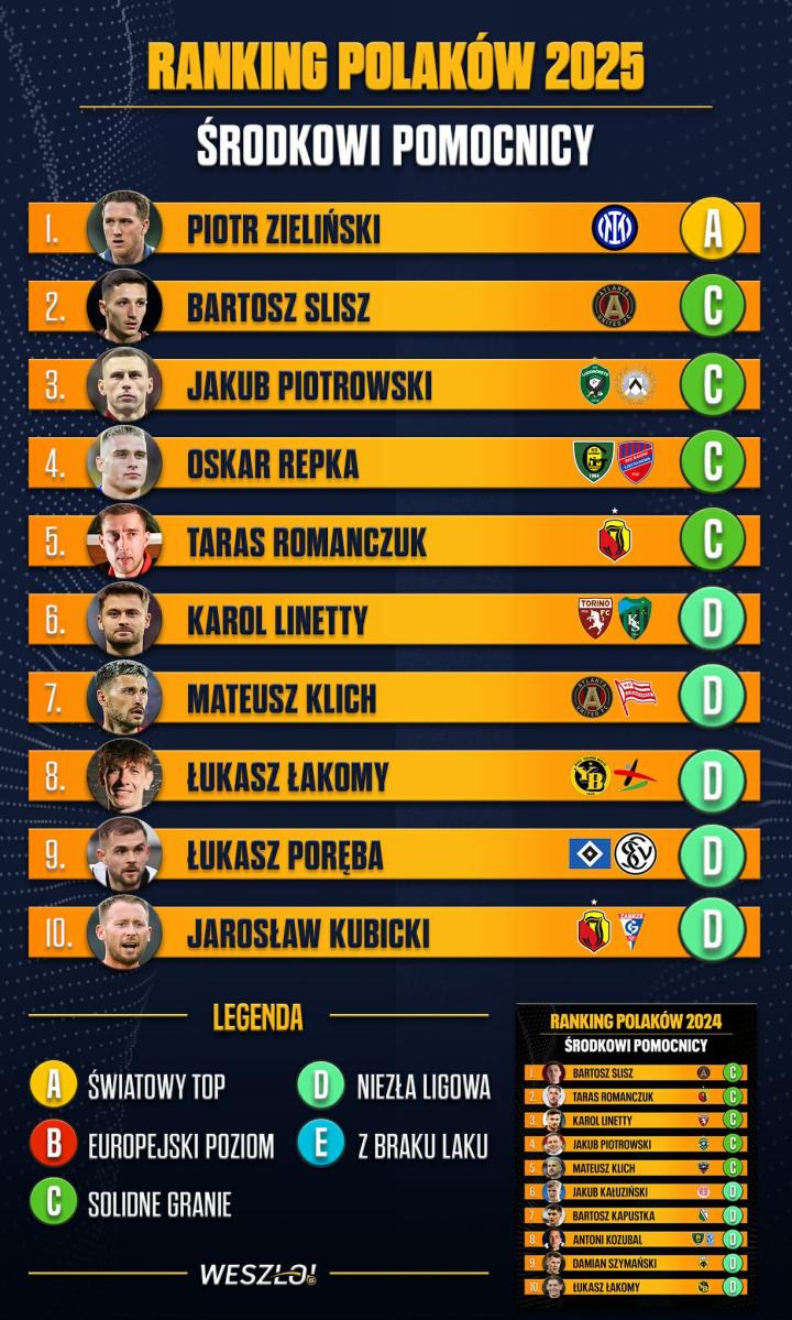 波兰媒体Weszło发布了2025年的波兰球员年终排名,第五份榜单对所有波兰中场和防守型中场进行了点评。泽林斯基高居榜首,斯利什与皮奥特罗夫斯基分列二三名。
