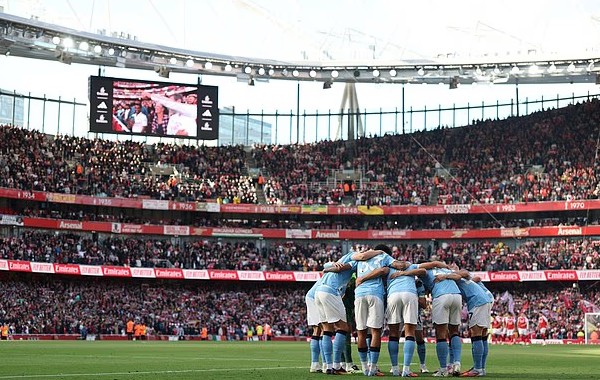 本赛季在酋长球场迎战阿森纳开赛前,曼城球员在客队看台前围城一圈