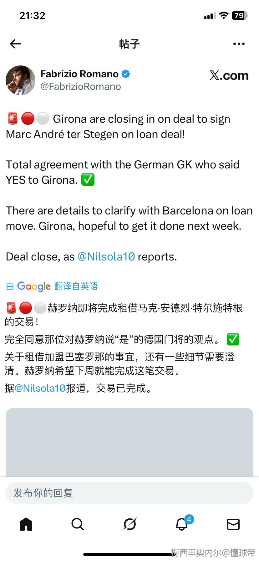 记者:特尔施特根离队计划重启,他越来越确信会加盟赫罗纳