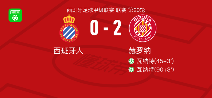 赫罗纳2-0西班牙人,瓦纳特包办2球