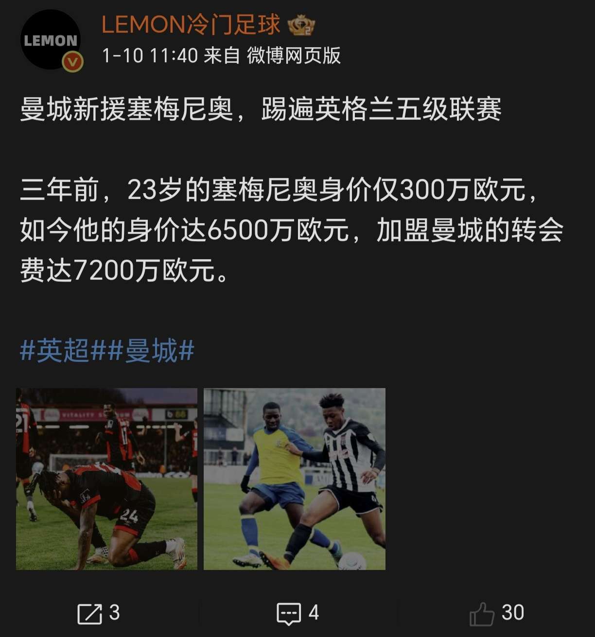 塞门约的职业之路始于十年前伦敦郊区的试训比赛。与周末全球数百万观众观看的曼城德比不同,那些比赛几乎没有观众,只有球探来考察是否有被足球学院漏掉的少年。