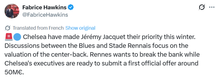 记者:切尔西准备向雷恩提交对雅凯的首份报价,约5000万欧