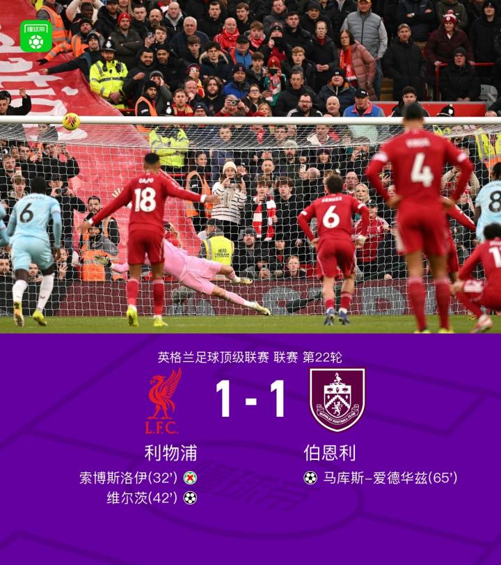 扫描下载懂球帝首页>动态> 剑南春|利物浦1-1伯恩利,维尔茨破门,索博斯洛伊失点
