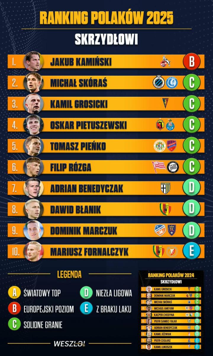波兰媒体Weszło发布了2025年的波兰球员年终排名,第七份榜单对所有波兰边锋进行了点评。卡明斯基领衔,斯库拉希位居次席,皮耶图谢夫斯基上榜。