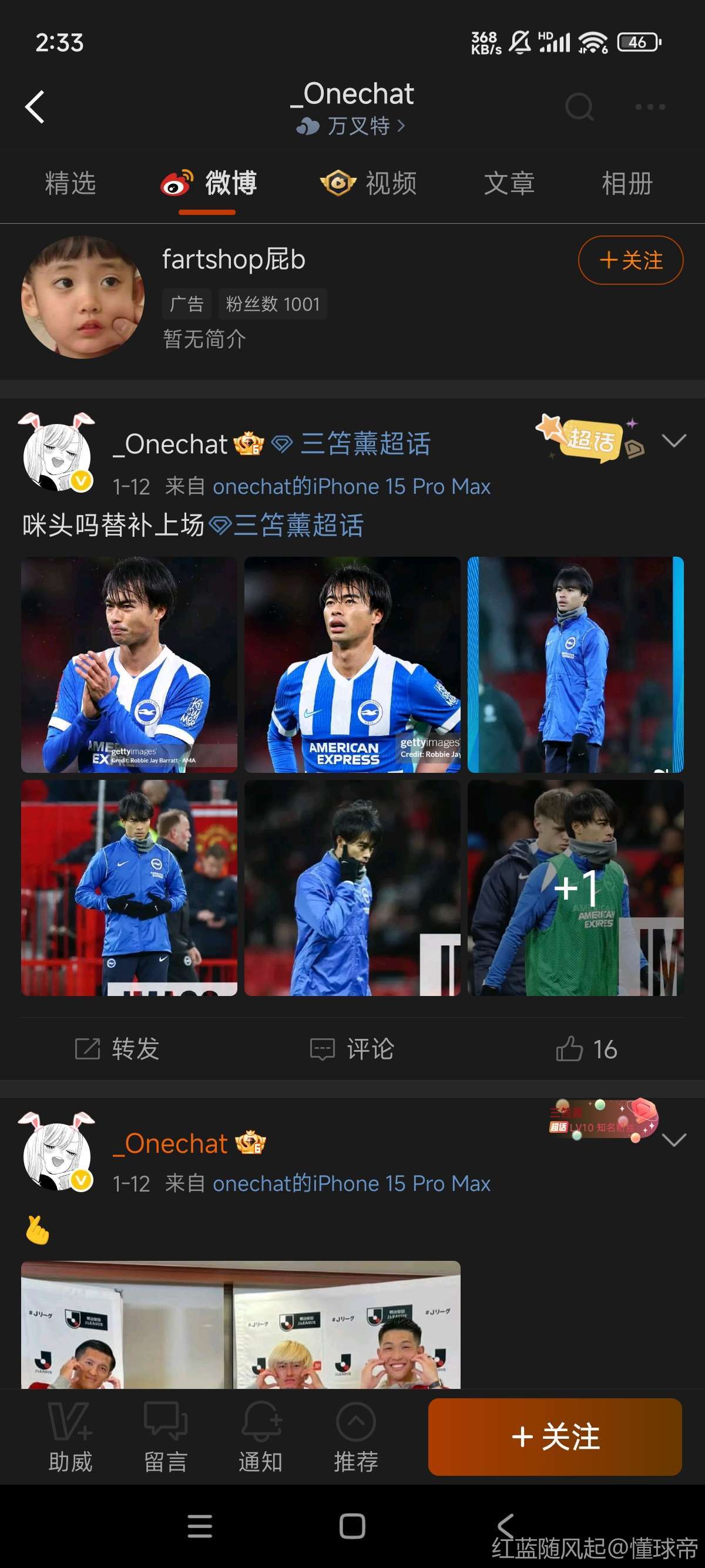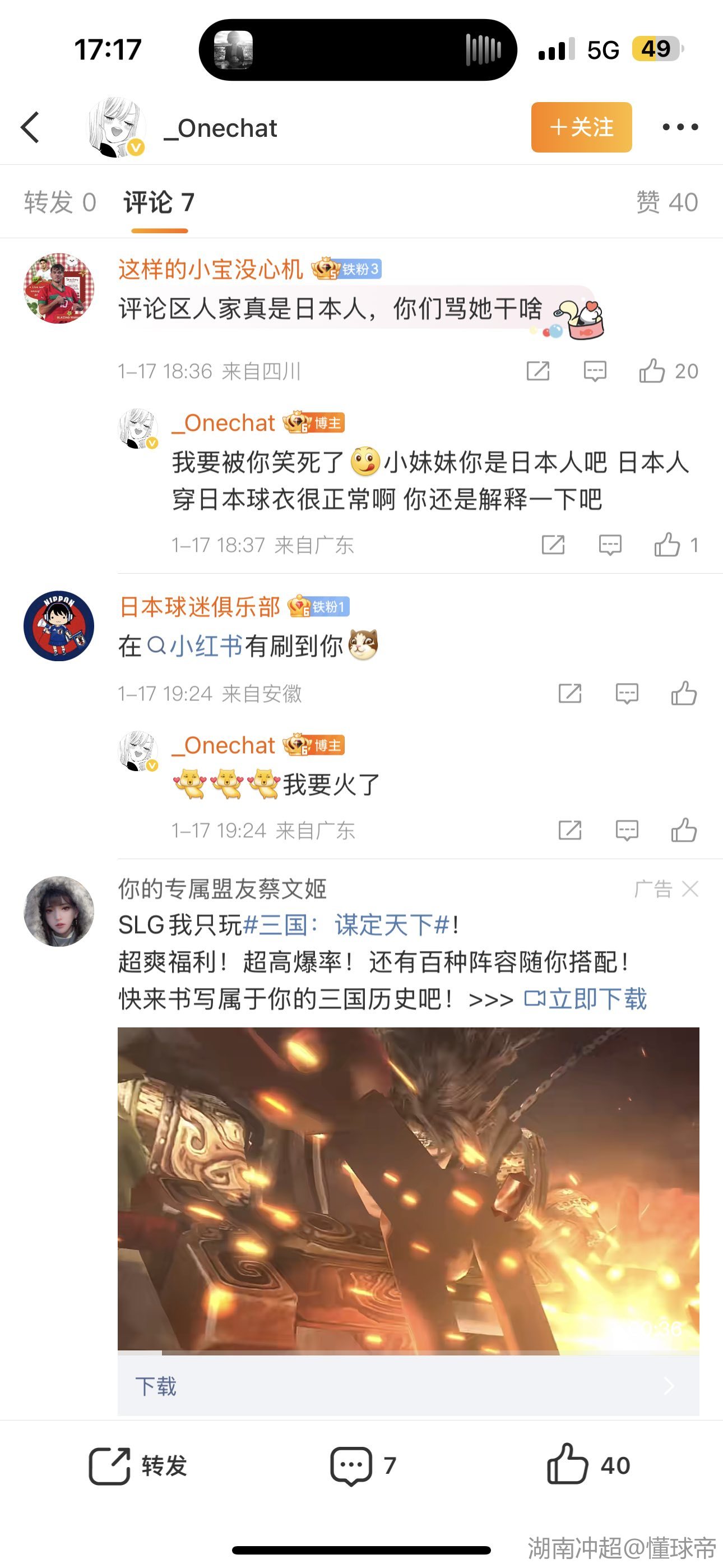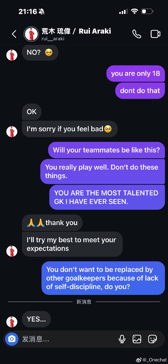1月18日,据微博博主_Onechat爆料,自己在评论日本U23门将荒木琉伟的社媒后遭到了对方的骚扰。由于引起热议,该博主又发布一条动态进行解释。