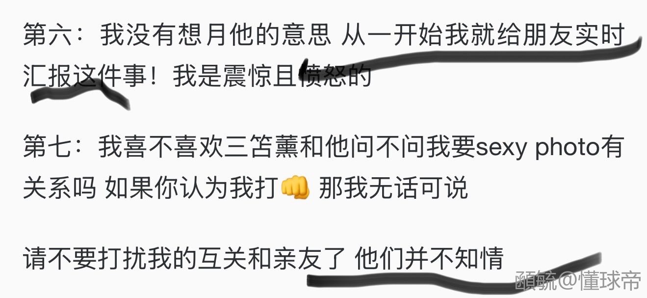 最后一句话应该不是第七条的延伸,更像是文章最后的一句结尾。和朋友实时汇报,最后又说互关和亲友并不知情?朋友与互关以及亲友取交集是空集?打👊我不在乎,卖惨求认同我也不在乎,别再一条条补充说明,占用公共资源了,来dqd不是刷这点破事🤷(本人擅长见人说人话 见鬼说鬼话 见鬼子可能说不了鬼子话,因为我不会日语😶)