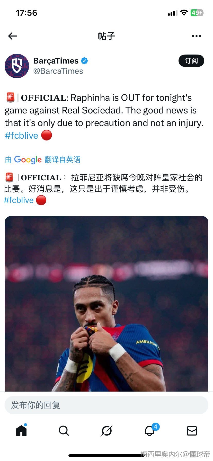 拉菲尼亚是上一场受到了撞击 巴萨队医谨慎考虑不让他踢这场 下轮欧冠就可以了