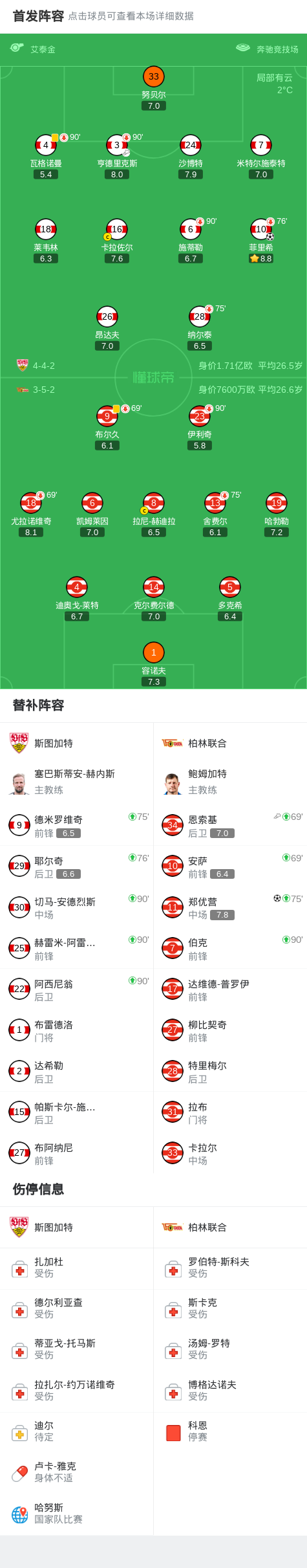 斯图加特vs柏林联合:努贝尔、昂达夫首发,尤拉诺维奇、容诺夫出战