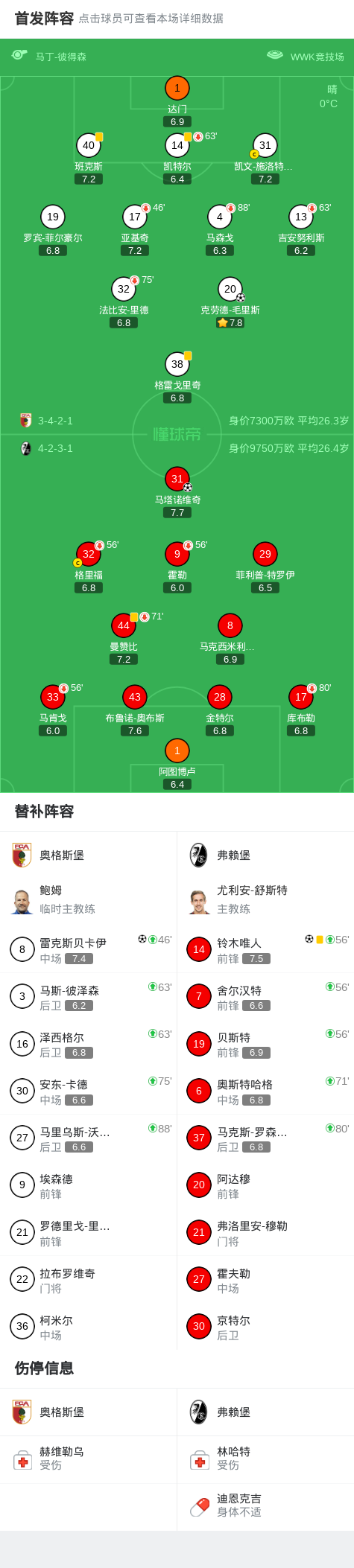 奥格斯堡2-2弗赖堡,克劳德-毛里斯破门,马塔诺维奇扳平比分