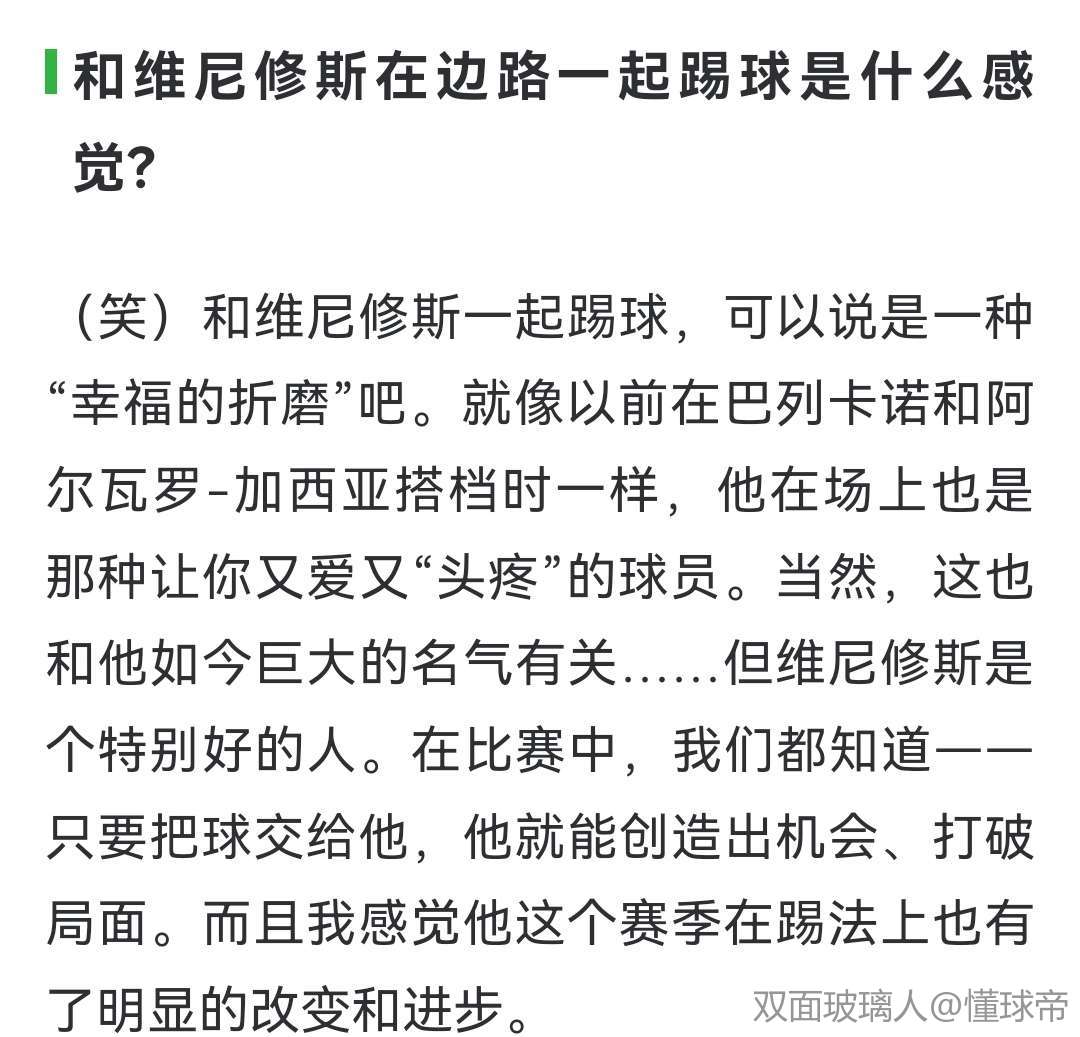 (笑)和维尼修斯一起踢球,可以说是一种“幸福的折磨”吧。就像以前在巴列卡诺和阿尔瓦罗-加西亚搭档时一样,他在场上也是那种让你又爱又“头疼”的球员。当然,这也和他如今巨大的名气有关……但维尼修斯是个特别好的人。在比赛中,我们都知道——只要把球交给他,他就能创造出机会、打破局面。而且我感觉他这个赛季在踢法上也有了明显的改变和进步。