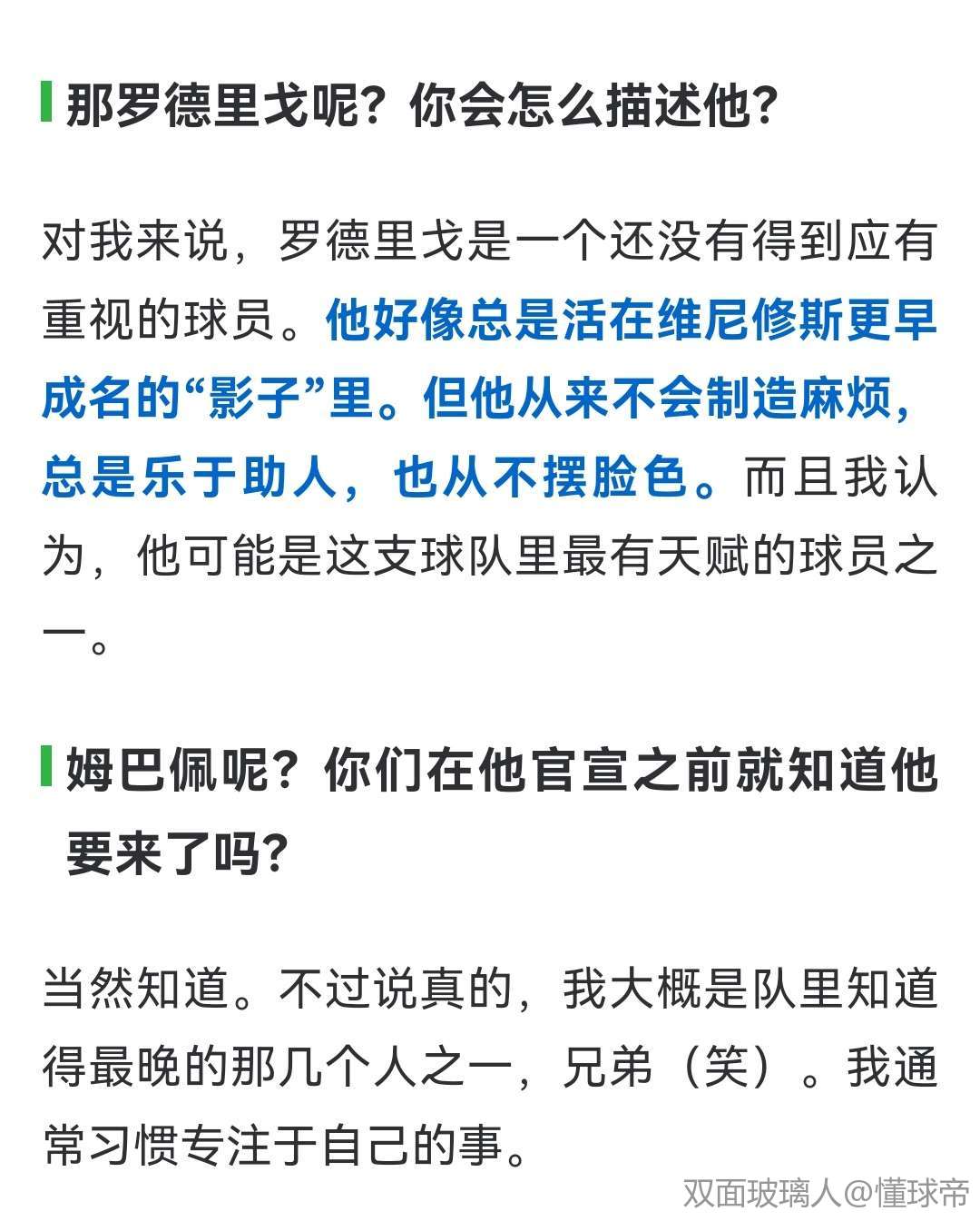 对我来说,罗德里戈是一个还没有得到应有重视的球员。他好像总是活在维尼修斯更早成名的“影子”里。但他从来不会制造麻烦,总是乐于助人,也从不摆脸色。而且我认为,他可能是这支球队里最有天赋的球员之一。