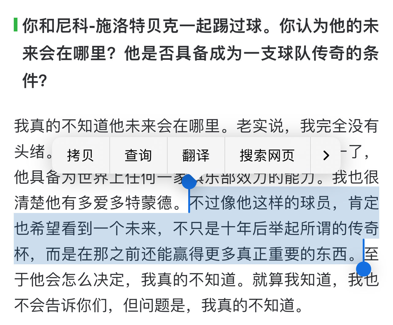 你和尼科-施洛特贝克一起踢过球。你认为他的未来会在哪里?他是否具备成为一支球队传奇的条件?