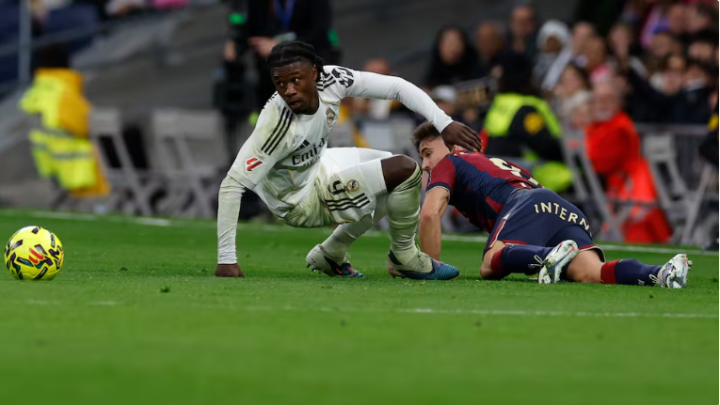 在看台上安切洛蒂的注视下(这位前主帅今夏离任,此役亲临伯纳乌观战),首发出任中场并与同胞楚阿梅尼搭档的卡马文加,在上半场遭遇了噩梦般的表现。